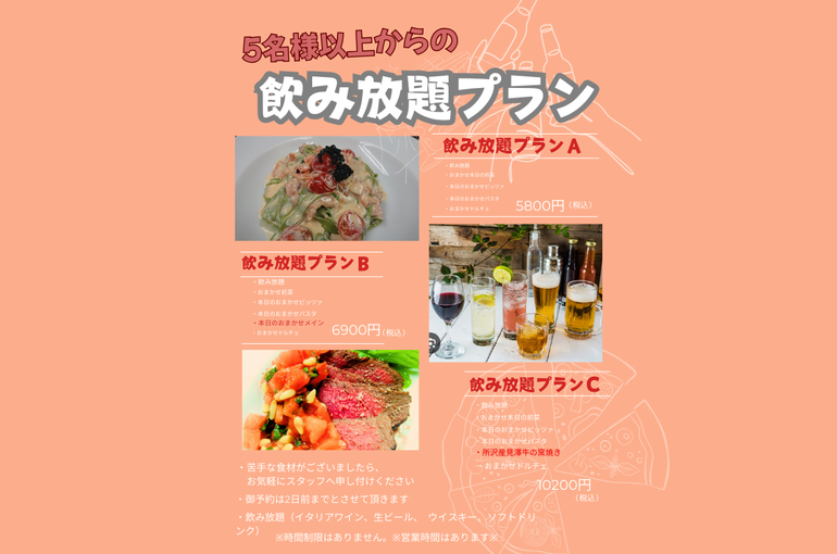 このプランでは、多彩なドリンクメニューを思う存分楽しんでいただけます。